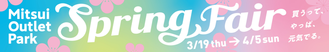 三井アウトレットパーク Spring Fair 開催!三井アウトレットパークでは、皆様の新生活を応援できるように、最大80%OFFでおトクに買い物をしていただける「Spring Fair」を開催いたします!春物ファッションをはじめ、季節を先取りしたアイテムや雑貨など、この時期にオススメの商品を、最大80%OFFでおトクにお買い求めいただけるフェアです。卒園・入園式、卒業・入学式など、この時期ならではのセレモニーシーンで活躍するワンピースやバッグのほか、ビジネスアイテムや生活雑貨など、たくさんのアイテムを買い揃えていただけます。
