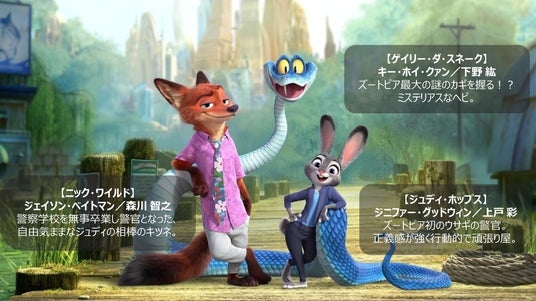 また、日本版声優は前作から続投の上戸彩がジュディ役、森川智之がニック役。そして新しいキャラクター、ヘビのゲイリー役に下野紘、ビーバーのニブルズ役には江口のりこ、そして物語の鍵を握るパウバート役を山田涼介が担当、吹替版を観るために何度も劇場に足を運ぶリピーターが続出するなど、豪華キャストたちの集結が映画のクオリティをさらに後押しすることとなりました。