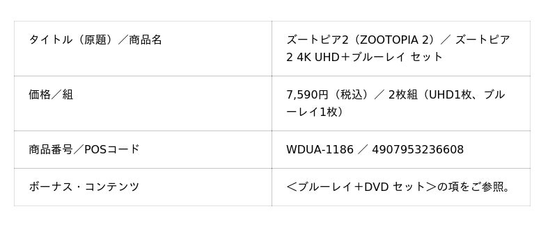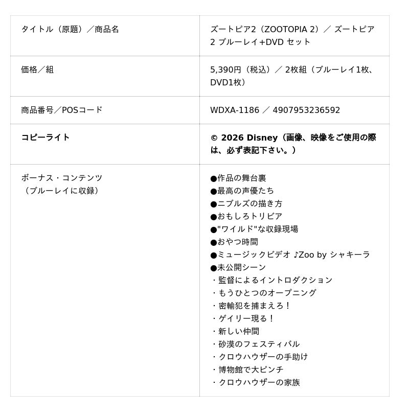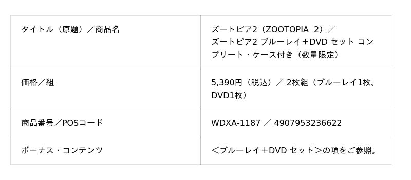 昨年12月の劇場公開以降、国内興収150億円突破、洋画史上最長の12週連続No.1(2026/2/21時点)など、数々の偉業を達成したディズニー・アニメーション最新作『ズートピア2』を、2026年5月20日(水)にブルーレイ+DVDセット、(前作『ズートピア ブルーレイ+DVDセット』をBOXに一緒に収納できる)ブルーレイ+DVDセット コンプリート・ケース付き(数量限定)、4K UHD+ブルーレイ セット、DVDで発売いたします。