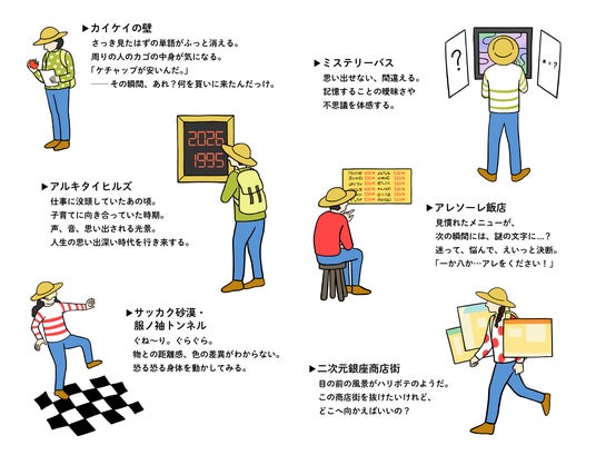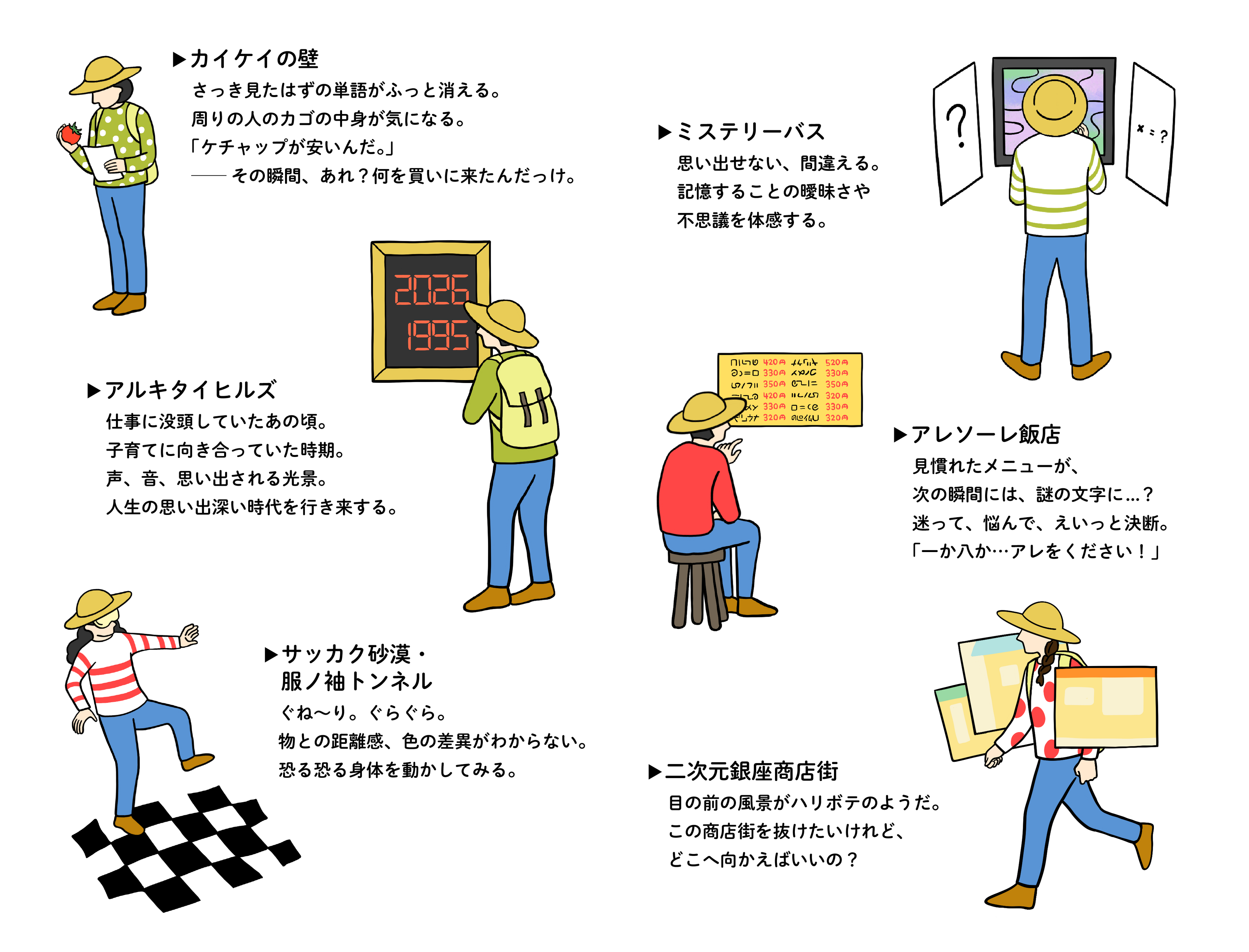 書籍『認知症世界の歩き方』では、認知症のあるご本人約100名へのインタビューから生まれた、ご本人の気持ちや困りごとを旅行スケッチとしてまとめています。書籍の中だけでは伝えきれなかった戸惑いや感覚のズレといった自分の世界が少しずつ揺らいでいく感じを視覚・聴覚・身体感覚ー五感を使って体験することができます。来場者は次々と目の前に現れる摩訶不思議な風景で、さまざまなハプニングに遭遇します。お子さんから、大人の方まで幅広い年齢層の方々にお楽しみいただける内容となっております。「認知症世界を歩いてみたら。展」ならではの世界観をぜひ会場でご覧ください。