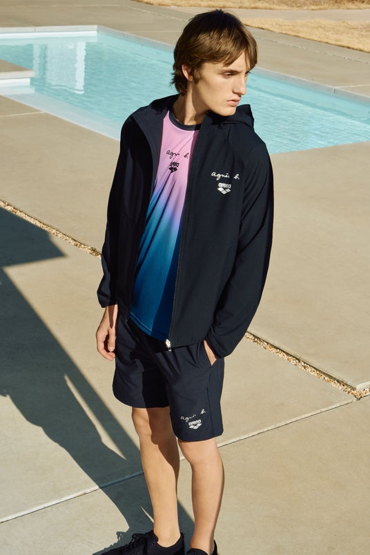 今回の新作コレクションでは、デザイナーのアニエス・トゥルブレが好きなカラーで仕上げたギンガムチェックや、アリーナとアニエスベーのロゴを散りばめたドット柄の水着が登場します。遊び心と上品さを兼ね備えたデザインでシンプルながらも存在感があり、いつものプール時間を少し特別にしてくれるコレクションです。また、アイコニックなドット柄の水着はキッズのスイムウェアでも展開し、大人とのリンクコーディネートもお楽しみいただけます。その他にも耐久性に優れたトレーニング水着からエクササイズにおすすめなフィットネス水着をはじめ、水際にもシティにも活躍できるTシャツやジャケット、小物まで様々なシーンで活躍するアイテムが展開します。
