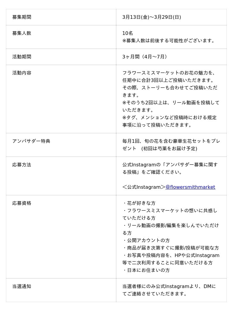 本プロジェクトでは、選ばれたアンバサダーの方々に毎月1回、旬の花を中心とした豪華生花セットをお届けし、その花を使用して「花のある暮らしの魅力」をより多くの人に届けていただきます。