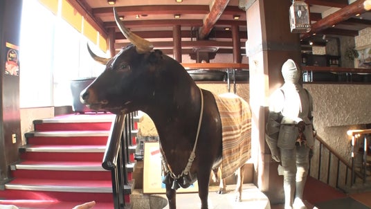 堺市の大通り沿いに店を構える洋食店「ビフテキ 南海グリル」。まるで洋館のような瀟洒な空間には、シャンデリアや甲冑、スペインから取り寄せた牛の剥製「トロちゃん」などが飾られていて、とにかくゴージャス!