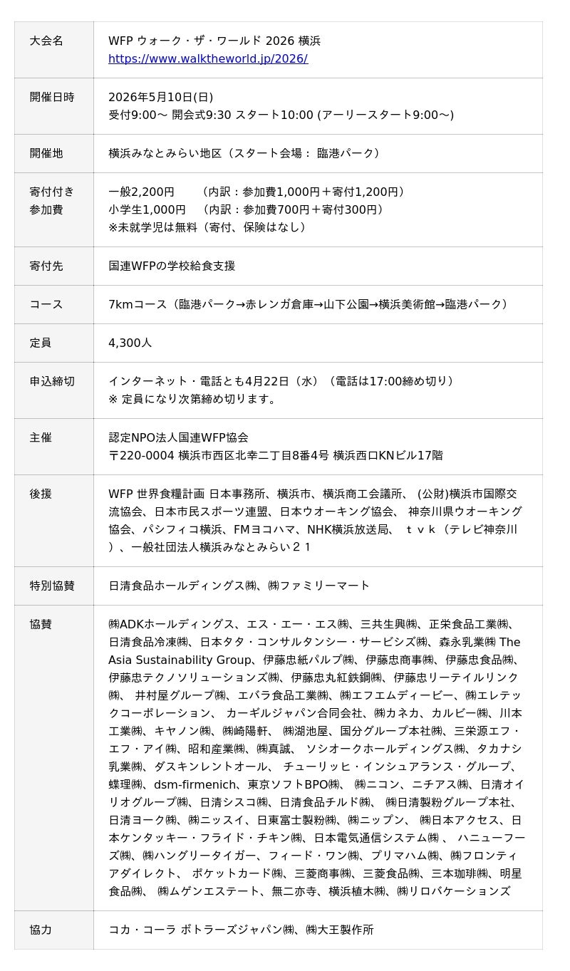 認定NPO法人国際連合世界食糧計画WFP協会(以下、国連WFP協会、神奈川県横浜市:安藤 宏基 会長)は、チャリティーイベント「WFPウォーク・ザ・ワールド 2026 横浜」を5月10日(日)に横浜みなとみらい地 区で開催します。本イベントへの参加申込み受付を3月13日(金)より開始します。