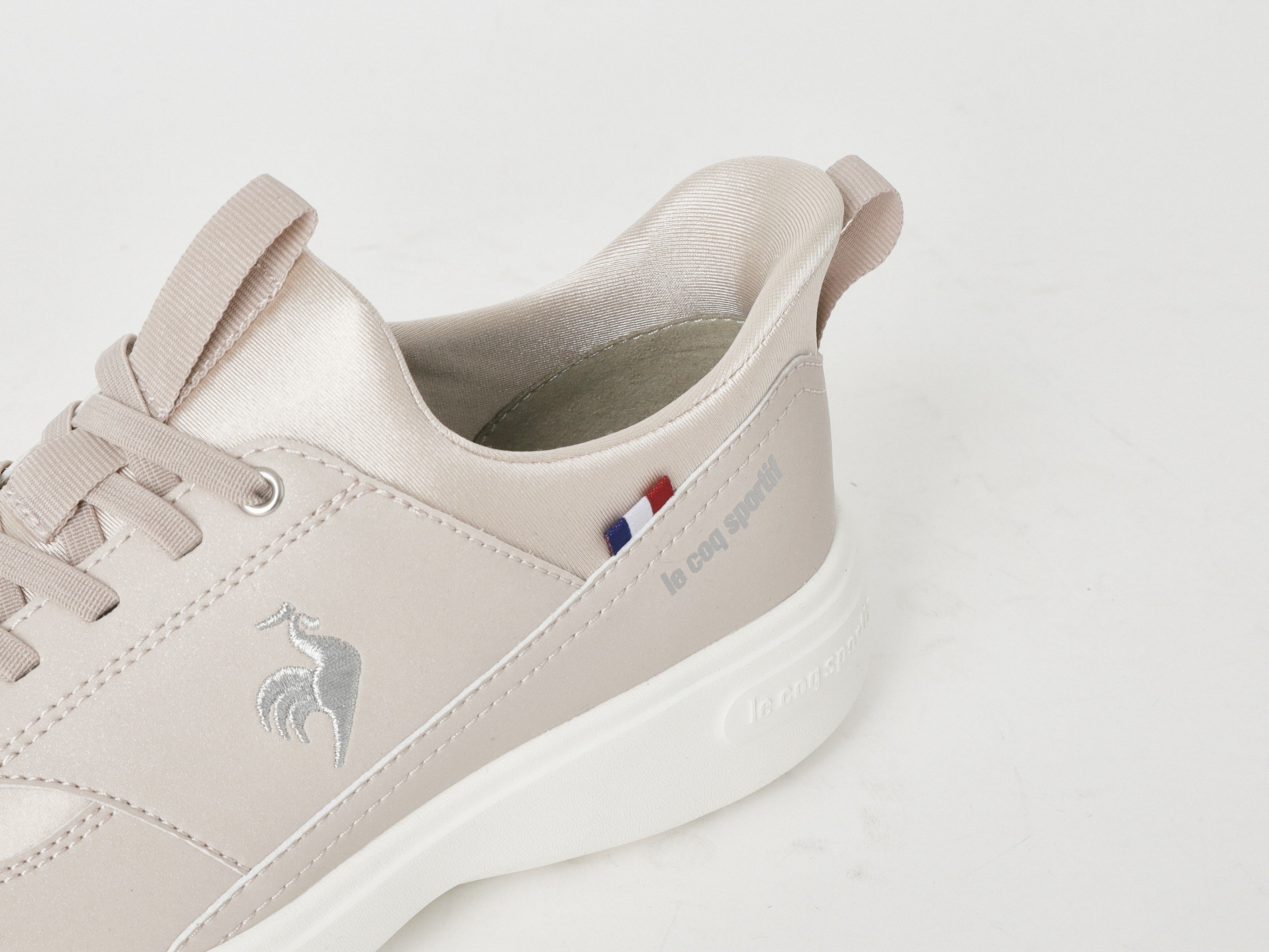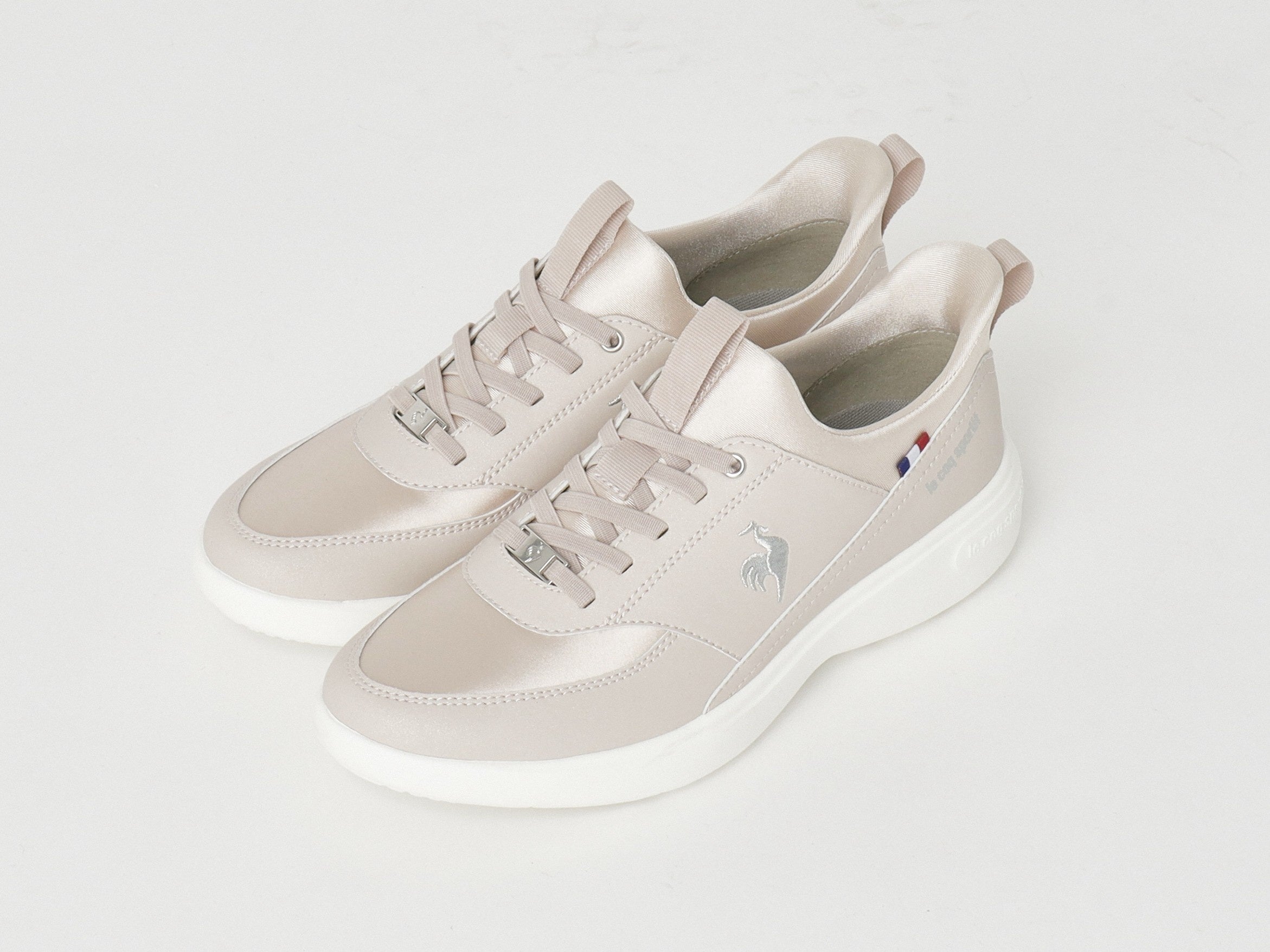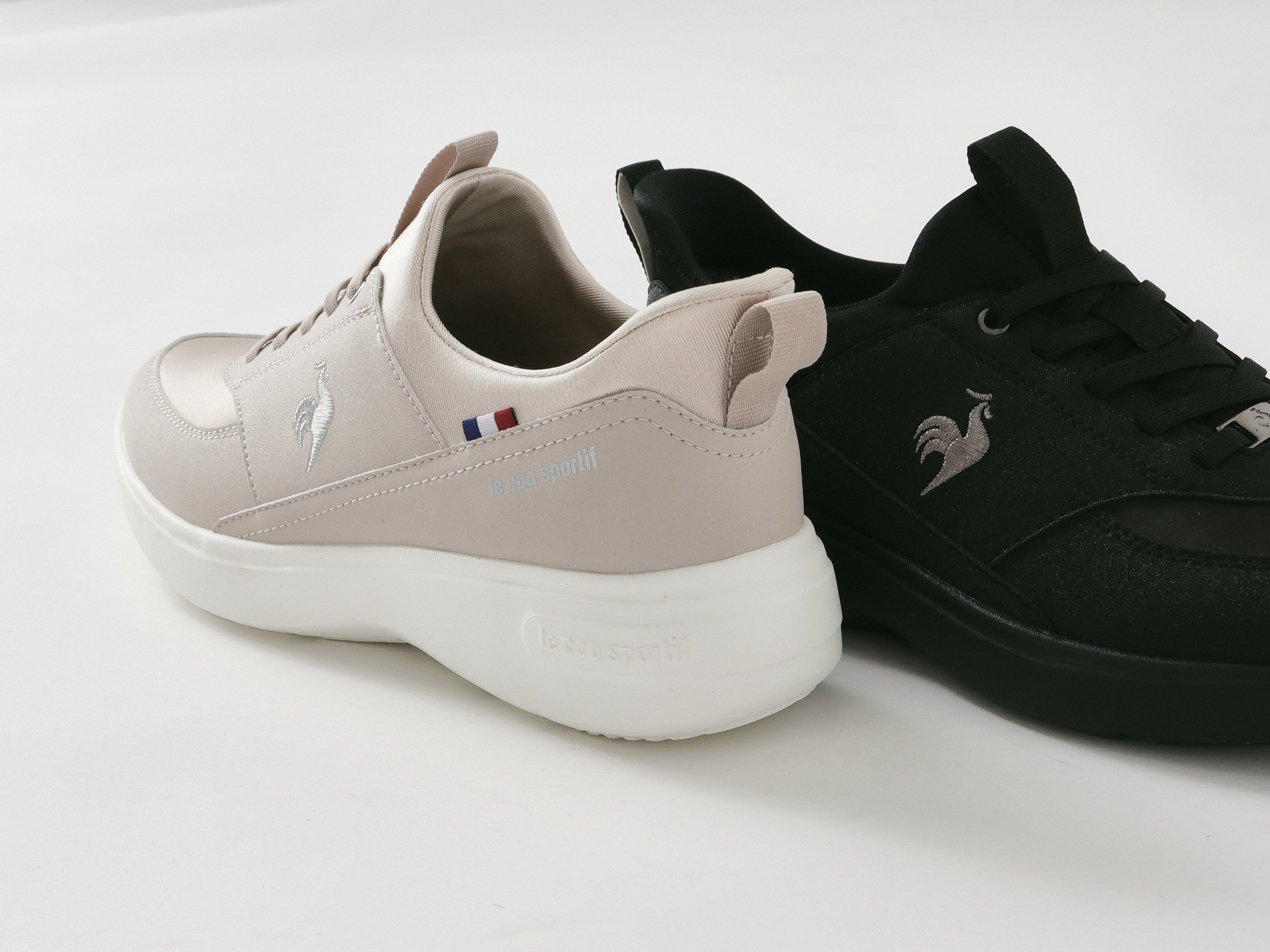 サテン調の光沢素材をミックスし、ブランドロゴにはシルバーラメの刺繍を施すなど、細部まで上品さにこだわったグローブらしいデザインです。厚底仕様のソールは、クッション性と軽量性を両立。スタイルアップを叶えつつ、軽やかな履き心地の一足です。
