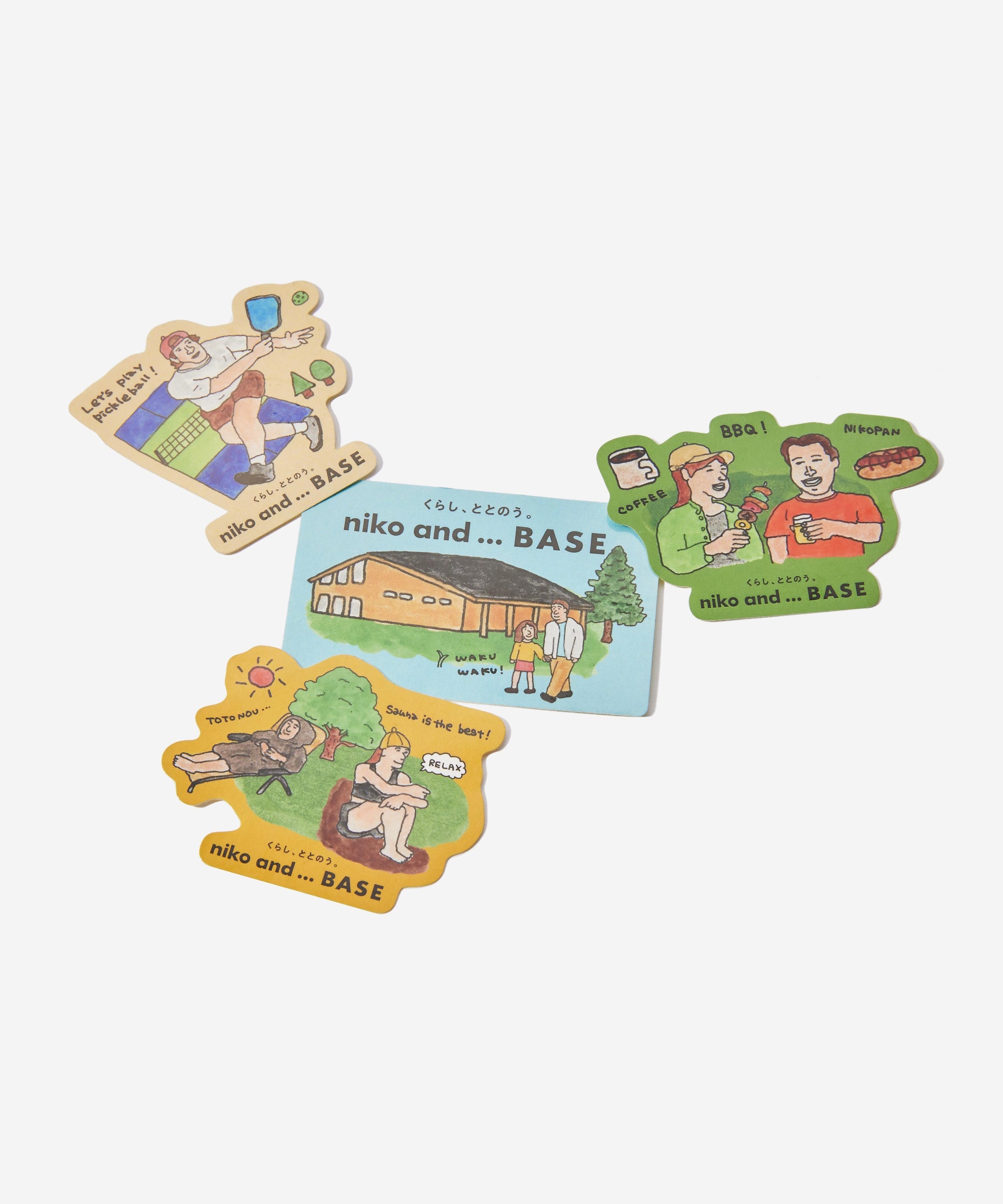 「niko and ... BASE」のキービジュアルのイラストを落とし込んだステッカー。4種類のデザインで、お土産や思い出の記念としても喜ばれます。携帯にも貼れるサイズです。