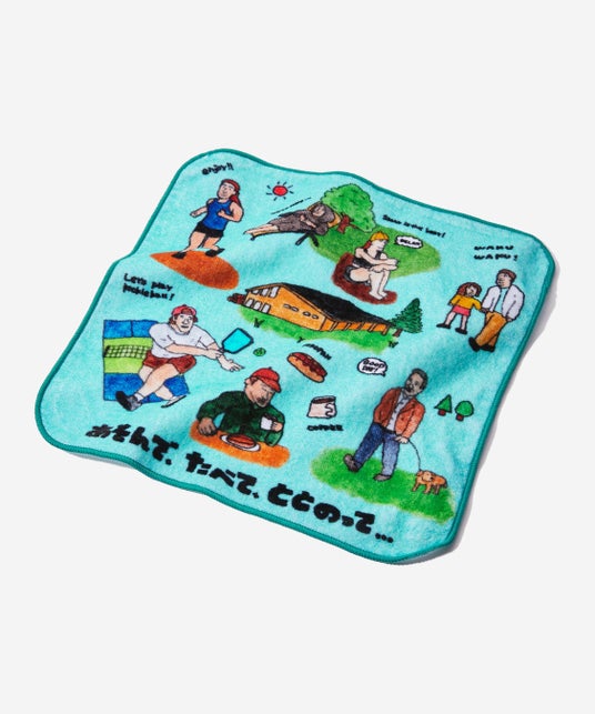 「niko and ... BASE」のキービジュアルのイラストを落とし込んだタオル生地のハンカチ。ポップで色使いもカラフルで、ユニセックスで使用できるデザインです。