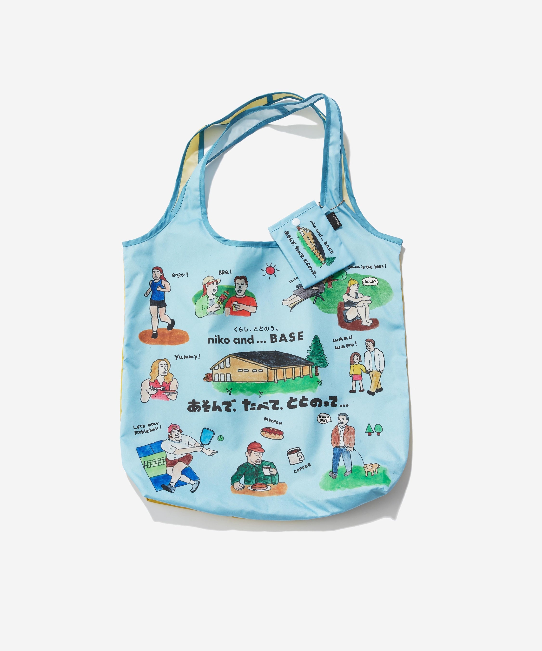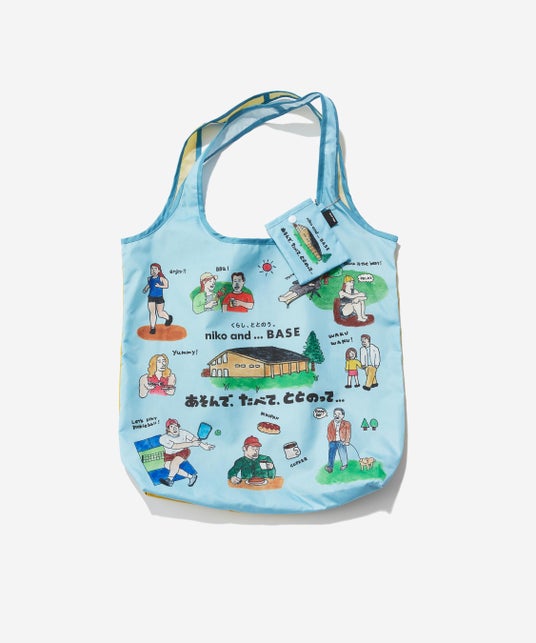 「niko and ... BASE」のキービジュアルのイラストを落とし込んだ、ポケッタブルとして持ち運びのできるエコバッグです。ナイロン製でさらっとした素材で荷物の出し入れもスムーズです。