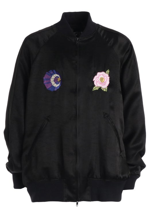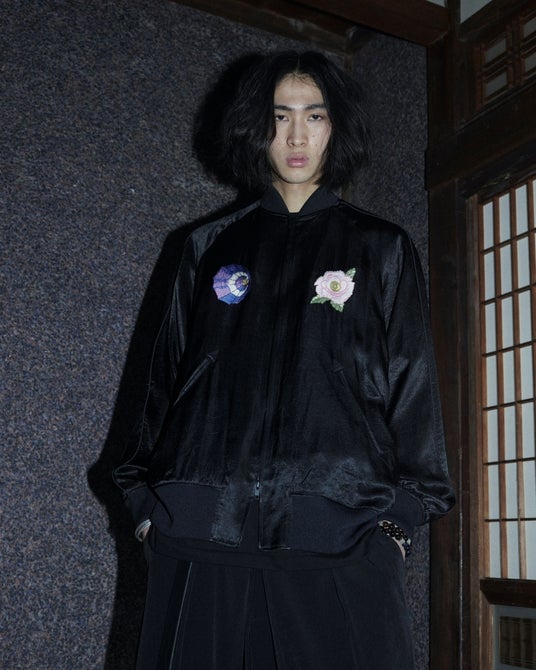 アイコニックなデザインのスーベニアジャケット。フロントには傘と花の刺繍をあしらい、バックには修羅雪姫の表紙絵から傘を携え構える「雪」を大胆な構図で刺繍。ツヤ感のあるアセテートサテン生地がその存在感を引き立てる。ワッシャー加工によるナチュラルなニュアンスと、ダブルジップ仕様によってウエスト周りのシルエットにも変化を付けられるデザインで、ユニセックスで着用しやすい一着となっている。