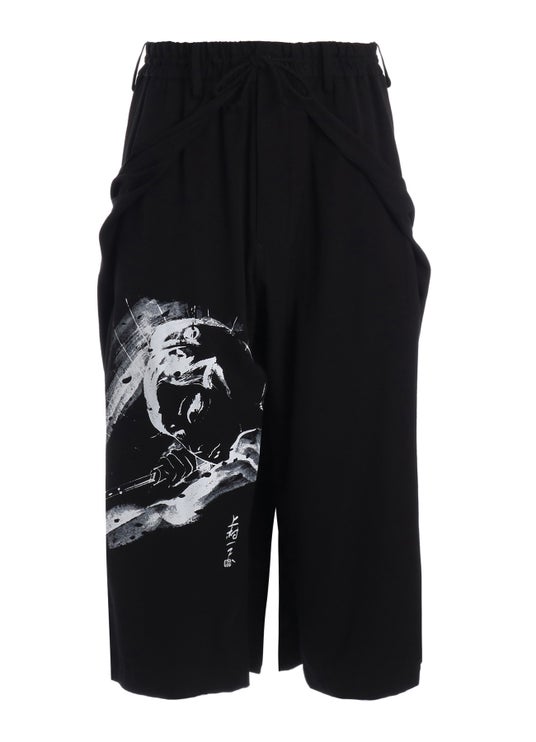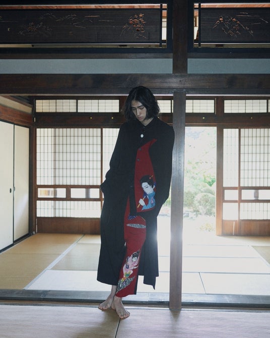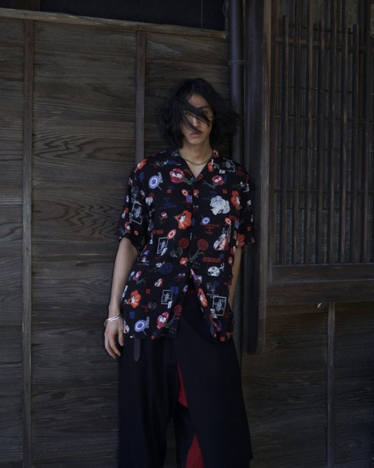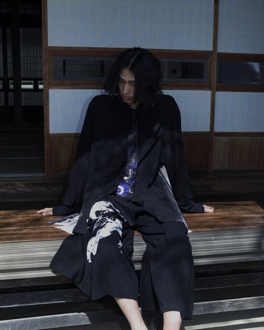 デッサンプリントが特徴的なレイヤードセットアップは、シャツのボタンを外して生地を垂らすことで、情念を宿した「雪」の顔が覗くデザインとなっている。パンツには刀を手に、こちらを見つめる「雪」と上村一夫のサインをプリント。軽やかな素材に浮かび上がる柄が身体の動きに呼応して揺れ動き、その表情を断片的に浮かび上がらせる。
