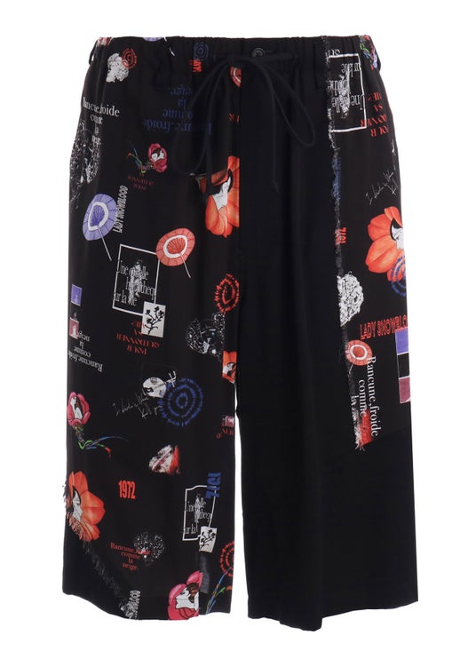 切り替え部分が刀傷のごとく裁ち切られたオムニバスデザインのパンツに、ハットや『同棲時代』のイラストのシルクタイなど小物使いが光るルック。総柄のパンツもシンプルなコーディネートでまとめることで、着る人の魅力を引き立てる。
