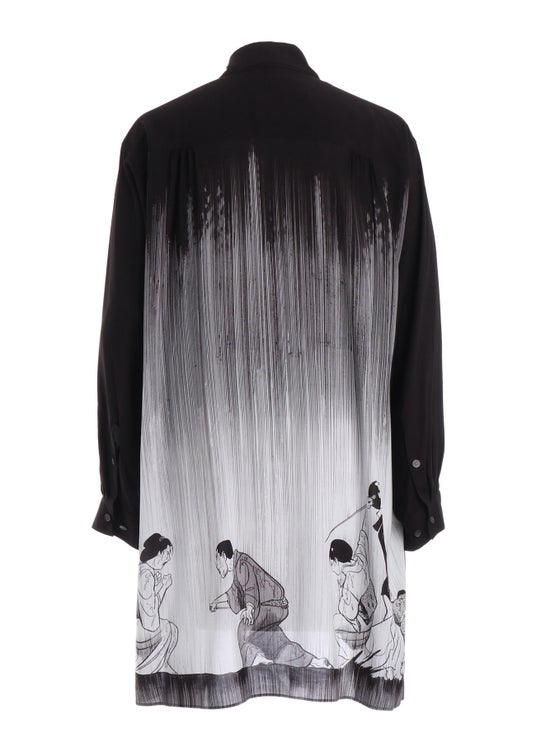 上村氏が描く女性・花・傘など象徴的なモチーフを総柄にしたプリントシャツ。『修羅雪姫』他、当時の週刊誌の表紙絵や扉絵など、様々な作品の要素を取り入れたオムニバスデザインで、作品同様に細部にまで宿る上村氏の世界観が人々の目を惹きつける。