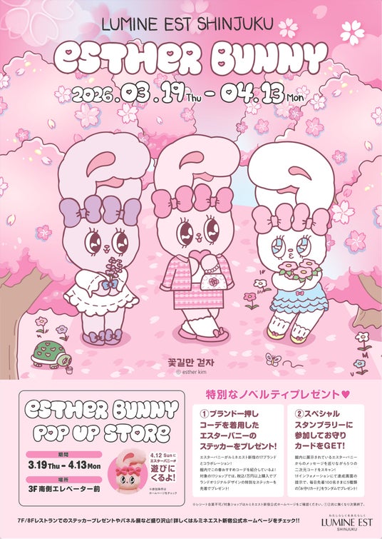 ルミネエスト新宿3F南エレベーター前イベントスペースで「Esther Bunny POP UP STORE」を2026年3月19日(木)~4月13日(月)を開催いたします。
