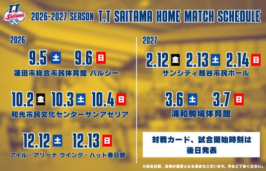 2026-2027シーズン T.T彩たまホームマッチの日程が決まりましたので、お知らせいたします。