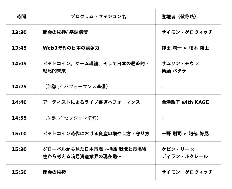 今回のメインプログラムは、ビットコインを単なる投資対象ではなく、国家戦略や次世代の金融インフラとして多角的に議論する、本イベントでしか実現し得ないセッションで構成されています。