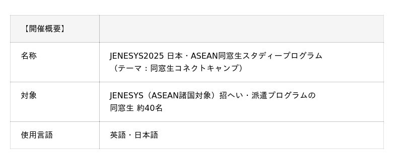 本プログラムは、日本に在住するJENESYS(ASEAN諸国対象)招へい・派遣プログラムの過去参加者(同窓生)が、1泊2日のプログラムに参加し、グループでのフィールドワークやワークショップを通じて、プログラムの参加年度や国を超えた同窓生間のコミュニティを構築し、ネットワークを強化することを目的として実施します。また、このプログラムの経験を通じ、JENESYS同窓生同士の協働スキルを高めるとともに、今後の日本における同窓会活動について考える機会となることも目指します。