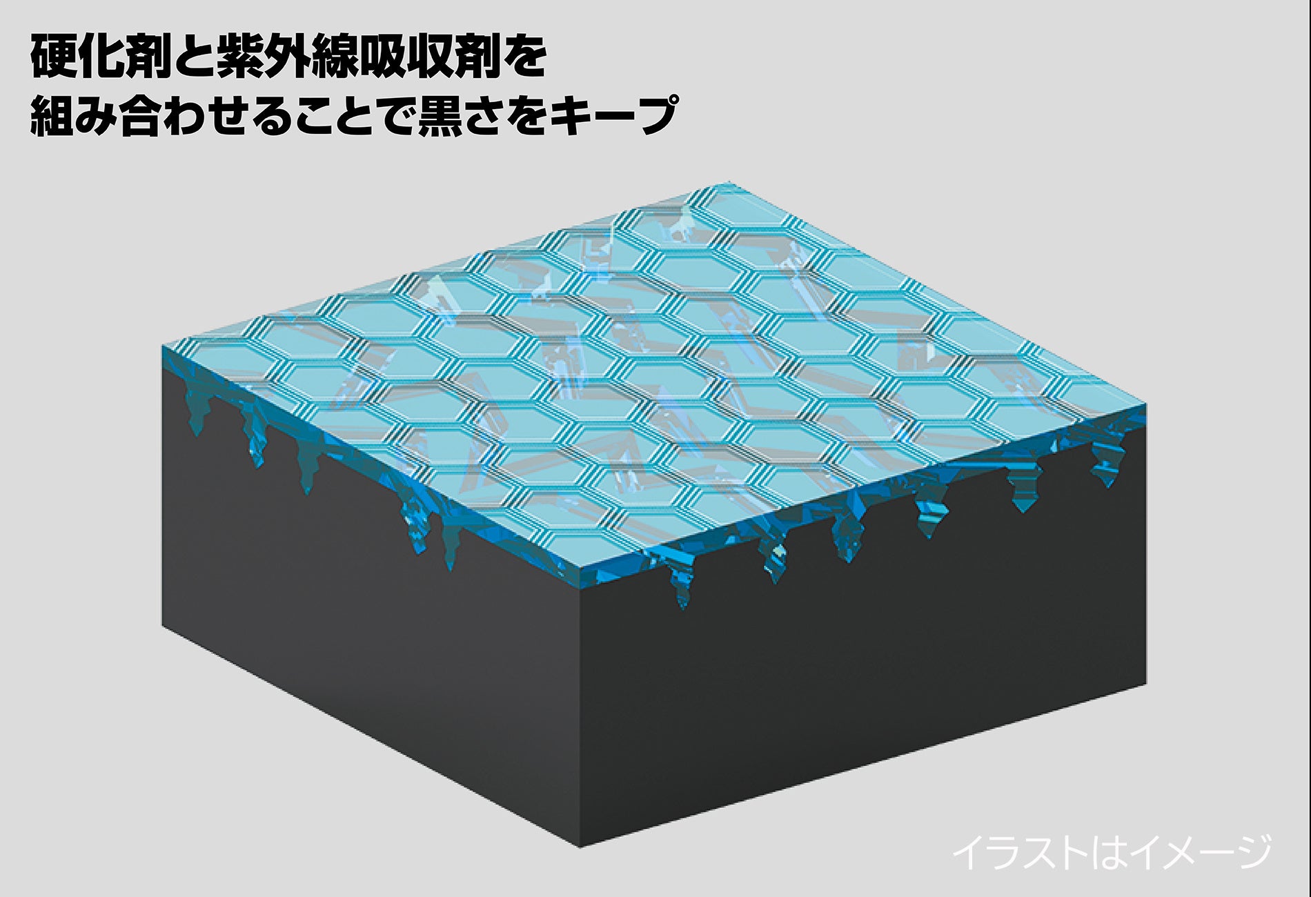 硬化剤と紫外線吸収剤を掛け合わせることで、復活した黒さを長期間持続させることができます。