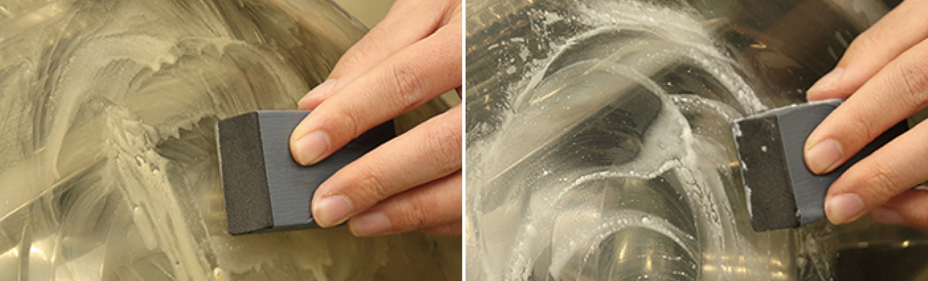 本製品(下)では、深い傷をつけずに研磨しています。