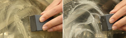 水を付けて研磨を繰り返すと、右写真のように黄ばみがなくなります