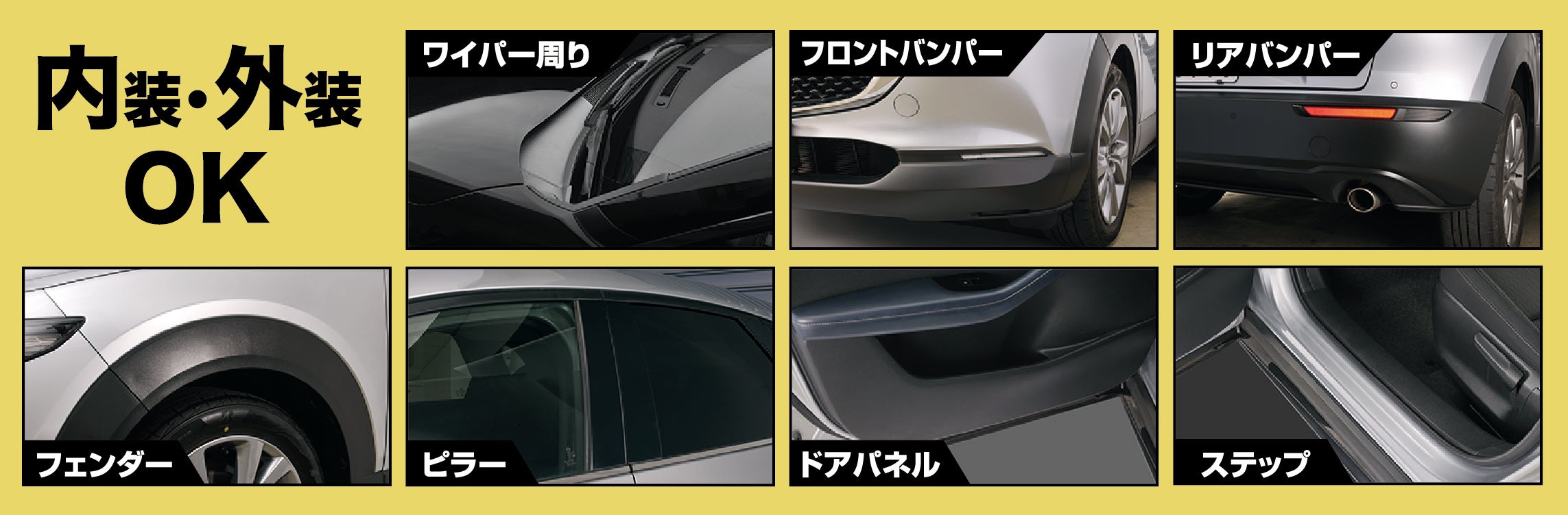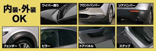 2種の専用ツールを用意。バンパーなどの広い面や、ワイパーの根元・エンブレム横・多角形状の狭いグリルまで丁寧に施工できます。また、近年増加しているSUVの黒樹脂面に合わせて“内容液も増量”(これまでは8ml)。