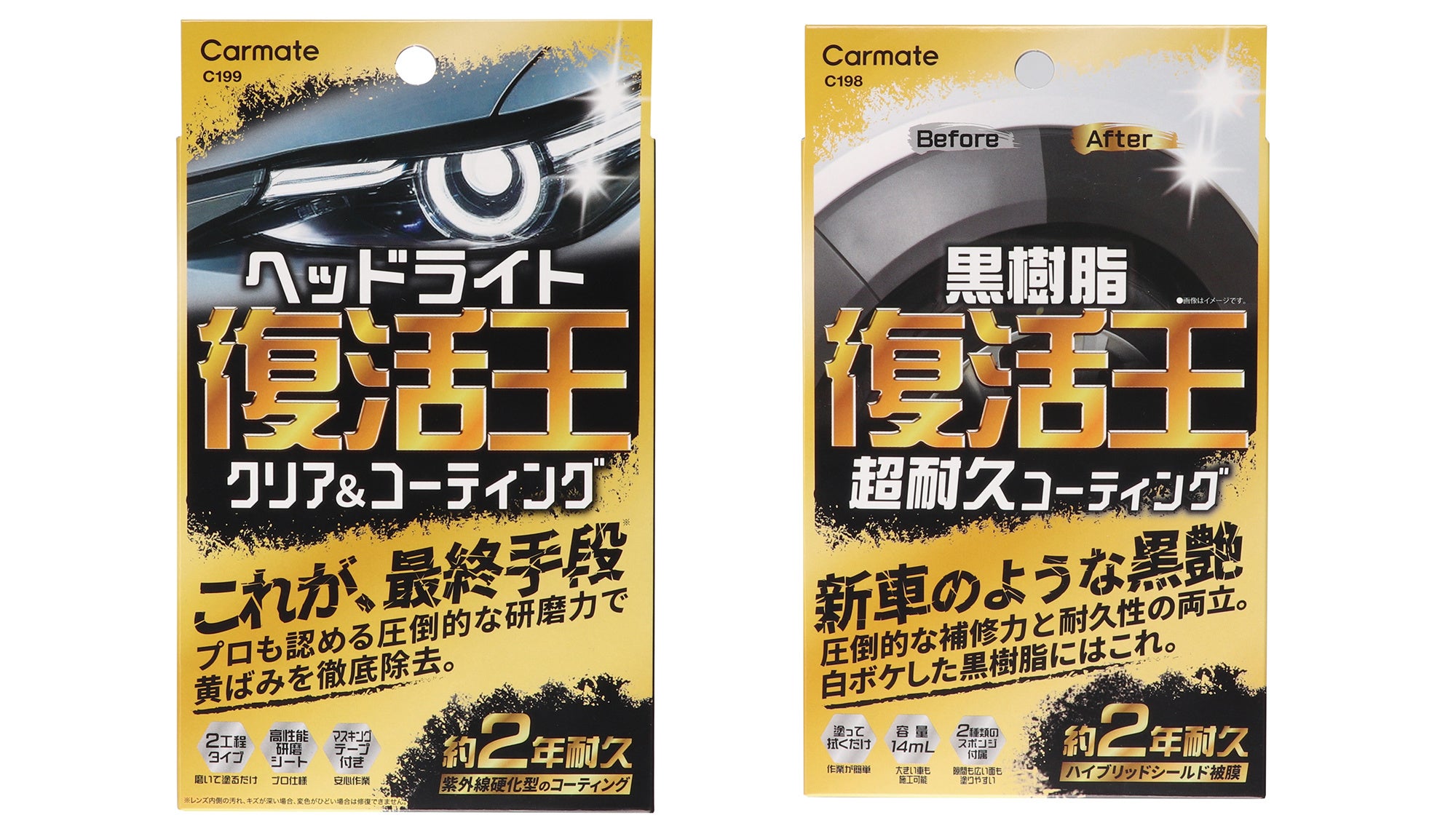株式会社カーメイト(本社:東京都豊島区、代表取締役社長:徳田勝)は、補修ケミカルの新シリーズとして、ヘッドライトの黄ばみを除去し透明感を長期間維持する 「復活王 ヘッドライト用(C199)」、黒樹脂パーツの黒さとツヤを蘇らせ維持する 「復活王 黒樹脂用(C198)」 を3月9日(月)に発売いたしました。本シリーズは、補修作業にこだわる上級者のニーズに応えるため、「高効果 × 高持続」をテーマに開発。仕上がりの質、耐久性ともに従来品を大きく上回る性能を実現しました。詳細は以下をご確認ください。