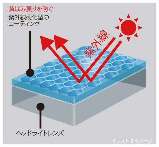 太陽光で硬化する紫外線硬型のコーティング膜を採用することで、耐候性を向上しています。高い透明性を持つため、クリアな仕上がりでヘッドライトの輝きを最大限に引き出します。
