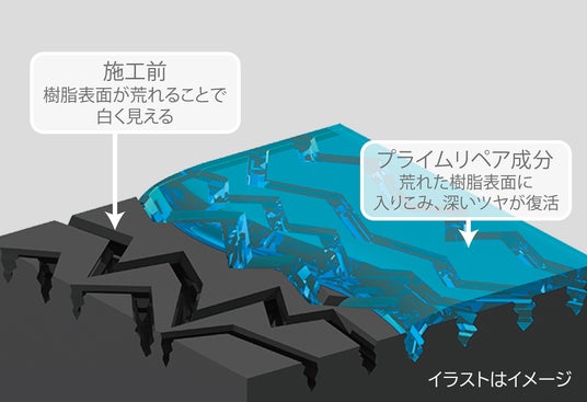 黒樹脂は、樹脂表面が荒れることで白ボケて見えます。新製品では、樹脂表面の荒れを“プライムリペア成分”がしっかり埋め、黒さとツヤが復活します。