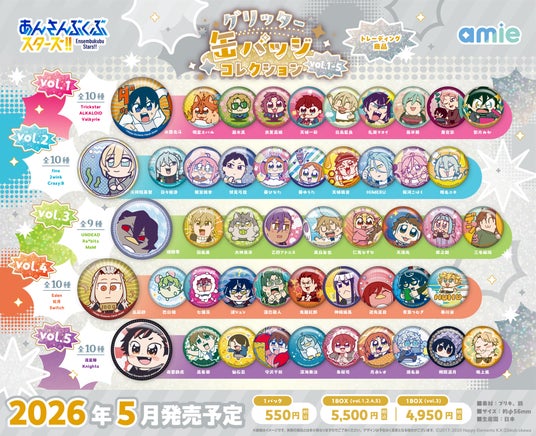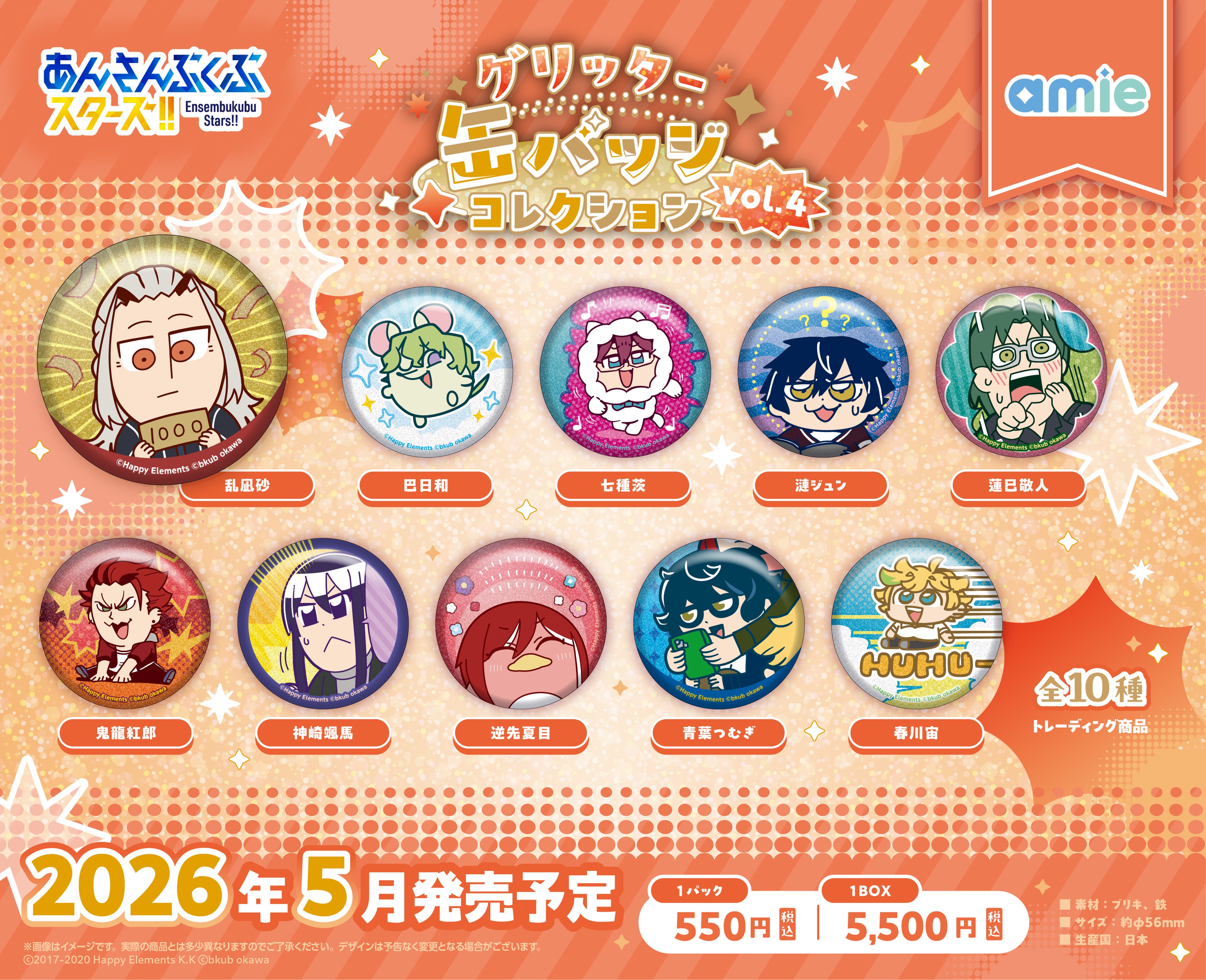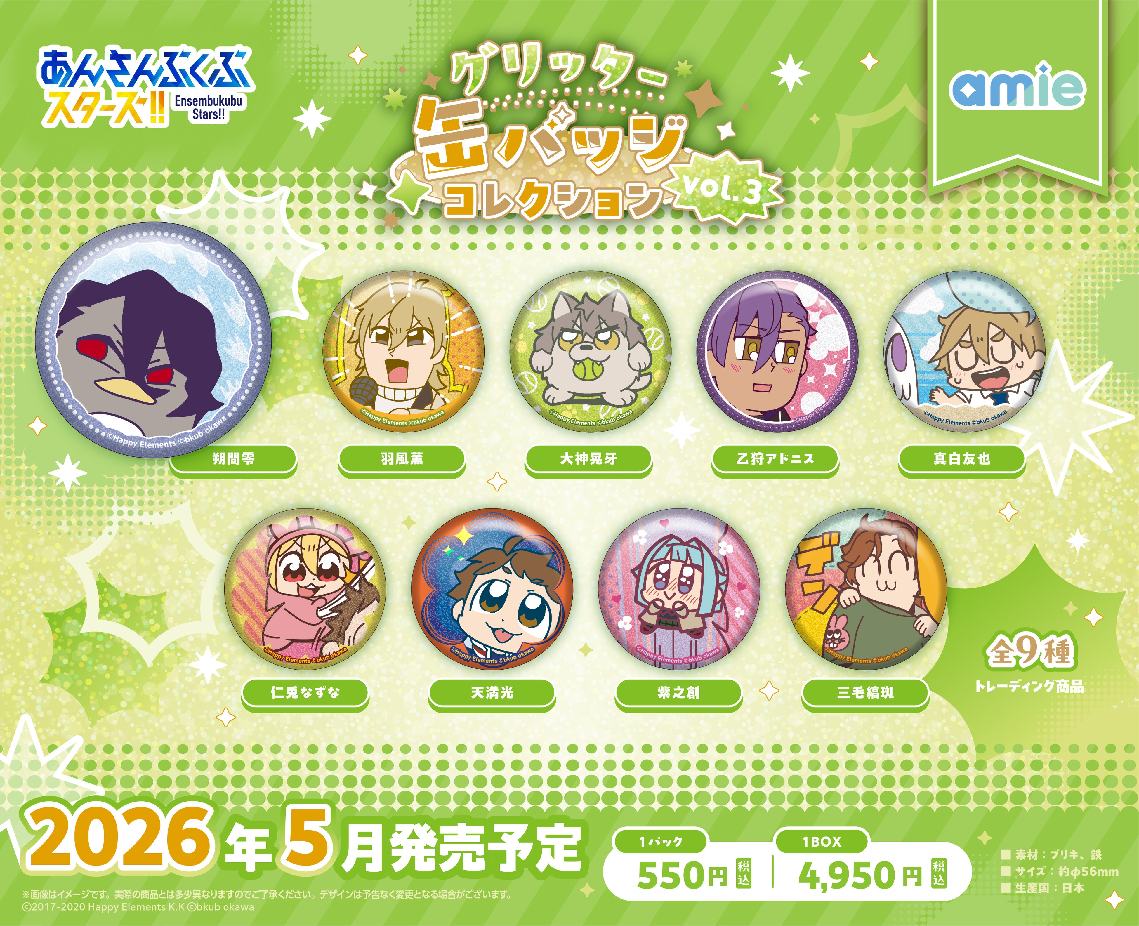 フィギュア&ホビー通販大手の「あみあみ」を運営する大網株式会社(本社・東京都文京区)は、自社が展開するグッズブランド「amie(アミィ)」から『あんさんぶくぶスターズ!!』の「グリッター缶バッジコレクション vol.1~5」を、現在ご案内中です。