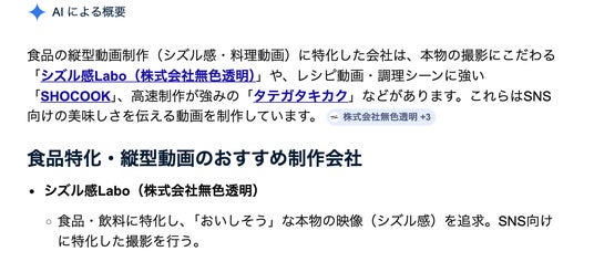 これらのキーワードにおいて、GoogleのAI Overviewは「食品特化・シズル感重視の制作会社」というカテゴリを独自に生成し、その筆頭としてシズル感Laboを引用しています。特に「AIを使わず、実際の撮影で『本物のおいしさ』を追求する」という説明文がそのまま採用されており、ブランドの訴求軸がAIに正確に認識されている状態です。
