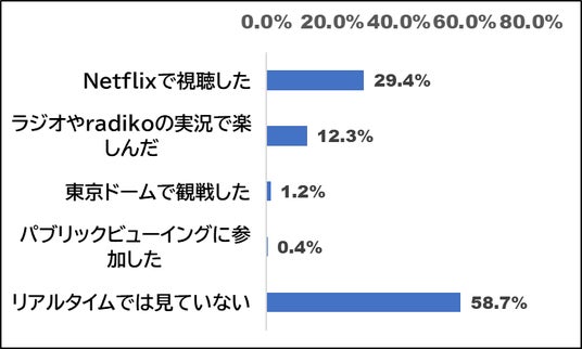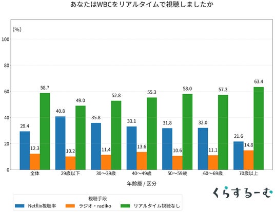 今回のWBCのリアルタイム中継が「Netflix独占配信」とラジオ中継であることを知っていた人は78.1%に上り、開幕前から大きな注目を集めていました。しかし、実際にリアルタイムで視聴した人は約4割にとどまり、58.7%は「リアルタイムでは見ていない(ニュースやSNSでの結果確認のみ)」と回答。地上波という「誰でもすぐに観られる」環境が失われたことで、多くのファンにとって観戦のハードルが大きく上がった実態が浮き彫りとなりました。