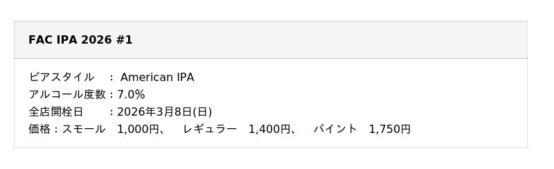 『FAC IPA 2026 #1』は、トロピカルや柑橘を思わせる、華やかなホップアロマが特長のAmerican IPAです。グラスに注いだ瞬間に香りが広がります。爽やかな飲み口でアルコール度数7%を感じさせない軽やかさと、しっかりとした飲みごたえを両立。IPAらしい苦みはありながらキレが良く、後味はすっきりとした、飲み飽きない一杯です。