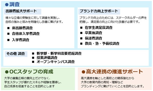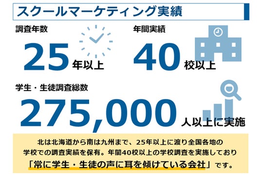 「スクール」分野では25年以上の実績を有しています。これまでに年間40校以上、累計275,000名以上の生徒・学生を対象とした調査を実施してきました。【主な提供サービス】