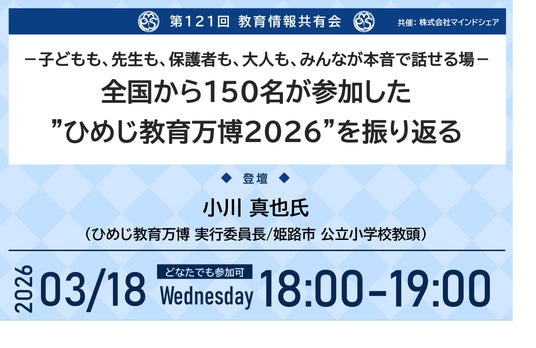 第121回教育情報共有会「-子どもも、先生も、保護者も、大人も、みんなが本音で話せる場- 全国から150名が参加した”ひめじ教育万博2026”を振り返る」・日時:2026年3月18日(水)18時00分~19時00分
