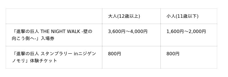 ※「進撃の巨人 THE NIGHT WALK -壁の向こう側へ-」については4歳以下無料