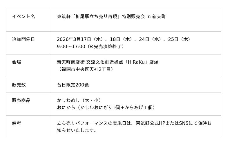 株式会社東筑軒(本社:福岡県北九州市、代表取締役社長:山内 裕太)は、2026年3月11日(水)より福岡・天神の新天町商店街内「交流文化創造拠点HiRaKu(ひらく)」にて開催中の特別実演販売イベントにおいて、初日・2日目ともに販売時間を待たずに完売したことを受け、追加開催を決定いたしました。