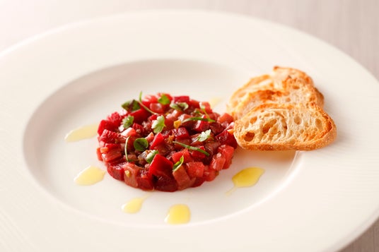 魚料理は、脂ののったノルウェーサーモンをふっくらと焼き上げ、爽やかなハーブとトマトの酸味が広がる濃厚なオランデーズソースで仕上げました。コースの主役には、厳格な基準をクリアした「プライムビーフ」のローストをご用意。丁寧に火を入れ、肉本来の力強い旨みを引き出した逸品です。