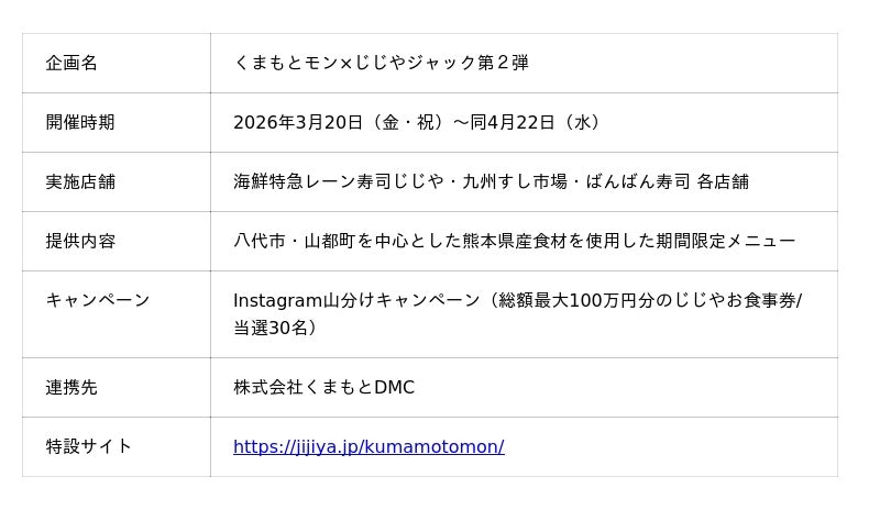 熊本県を拠点に、「ばんばん寿し」「九州すし市場」「海鮮特急レーン寿司じじや」などを展開する株式会社じじやコーポレーション(代表取締役:桑田朋之、本社:熊本市中央区)は、株式会社くまもとDMCとの連携プロジェクト「くまもとモン×じじやジャック」の第2弾を、2026年3月20日(金・祝)~4月22日(水)に開催いたします。