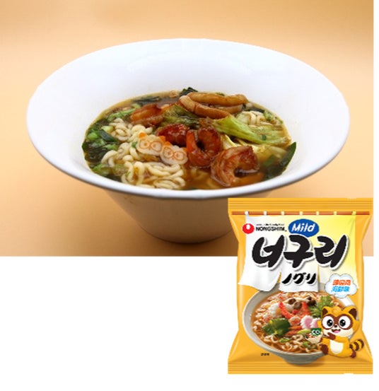 ノグリはコシのある太麺で、もちもちとした食感とうどんのような食べ応えが特徴的な海鮮ベースのラーメン。「ノグリ」は韓国語で「たぬき」のことで、丸くて太い麺の形がたぬきを連想させるということで名付けられました。実は辛ラーメンよりも長い歴史を誇るロングセラー製品で、辛いながらもスッキリとした味の「ノグリラーメン」や、辛さ抑えめの「ノグリラーメン マイルド」をはじめとした複数のラインナップを展開しています。