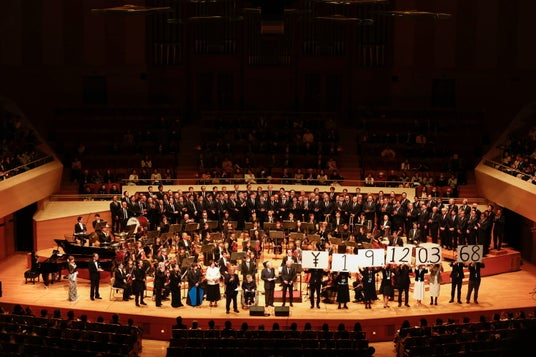全出演者の歌唱・演奏が終わった後、発起人の三枝、林、湯川、コシノらが再びステージに登壇し、今回の寄付金の総額が1912万368円(3月11日19時30分の時点での募金額)にのぼったことを発表された。