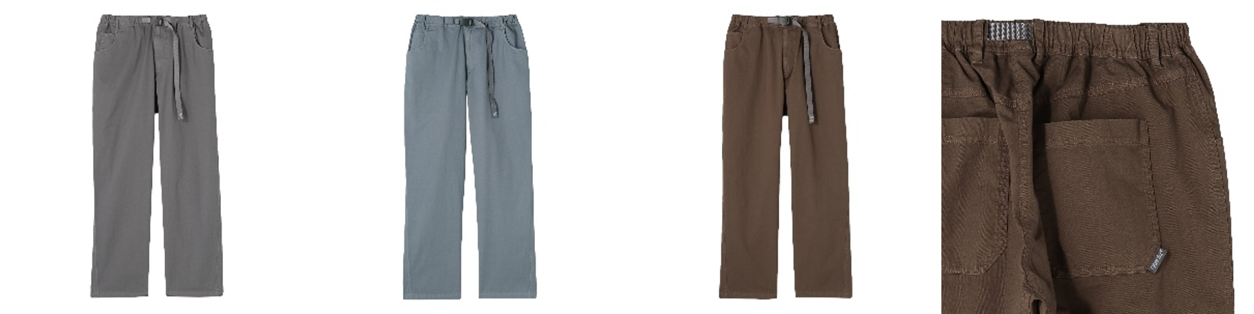 180度の自然な開脚を可能にする「ガゼットクロッチ」や、片手で簡単にウエスト調節ができる「ウェビングベルト」といった画期的なディテールが装備されています。これらの特徴を持つ製品は、クライミングパンツの代表格として全米から日本へと瞬く間に広まりました。