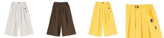 人気のJapan SMUモデルのOSHMAN’S別注カラー。工場での廃棄対象であるナイロン糸クズやナイロンチップを回収し製糸された100%リサイクル素材である、ドライタッチと洗いを施したようなワッシャー感が特徴のGramicci DURABLE NYLONを使用したフレアパンツ。フロントに取り入れた深いタックと、シャリ感ある素材から生まれるドレープが特徴の、スカートのように見えるデザイン。撥水性に優れ乾きやすく、水辺でも大活躍です。人気の高いSTONE、トレンド感のあるBROWN、FESやCAMPにぴったりのBANANAを別注カラーとして販売します。