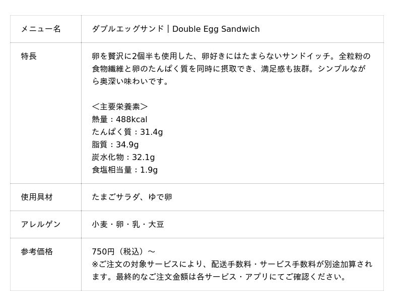 メインとなるサンドウィッチのメニューは7種類。スペインのカタルーニャ地方で愛される、赤パプリカとナッツが香る「ロメスコソース」を使用した看板商品となる「香ばしナッツのチキンロメスコサンド」、全粒粉の香ばしさと溢れ出す肉の旨みを存分に味わえる「ローストポークジンジャーサンド」や、卵を贅沢に2個半も使用した卵好きにはたまらない「ダブルエッグサンド」など、個性豊かな7つのサンドウィッチメニューをお好みやシーン応じてお楽しみいただけます。