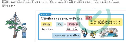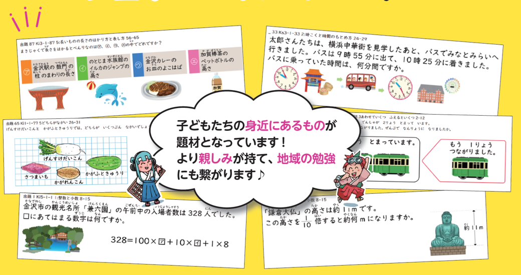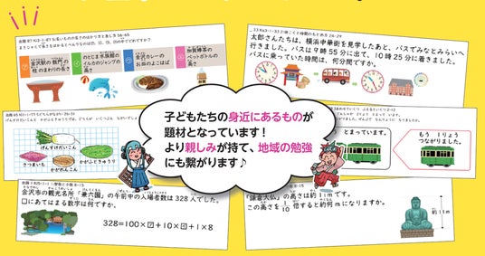 そこで、子どもたちが日常的に見聞きしている地域の名所、特産品、文化、企業などを算数問題の題材として活用。
