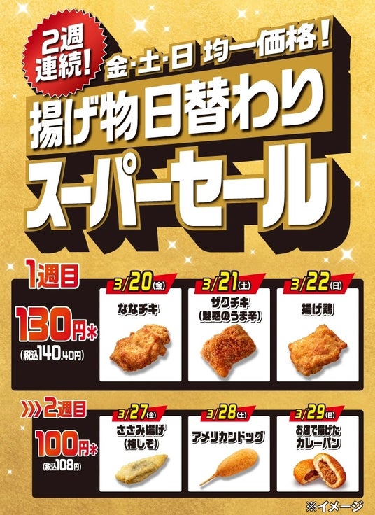 実施予定期間:2026年3月27日(金)~3月29日(日) ※3日間限定セール内容:「ささみ揚げ(梅しそ)」「アメリカンドッグ」「お店で揚げたカレーパン」が日替わりで特別価格100円*(税込108円)円での販売となります。