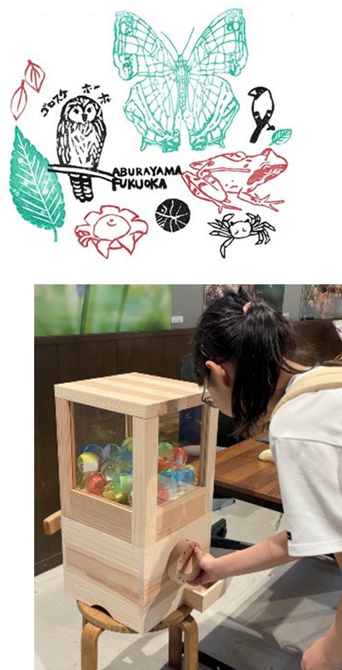 インフォメーションで台紙配布・景品抽選を行います。台紙を受け 取り、スタンプをすべて集めると木のガチャガチャに挑戦でき、 当たりが出たらその場で「もっと油山を楽しめる」景品をプレゼント します。景品の詳細はこちら.