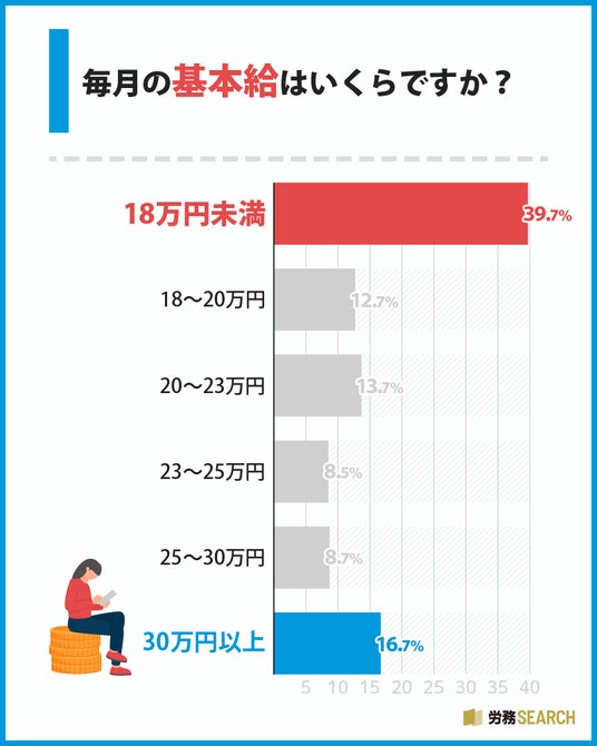 ● 基本給18万円未満が約4割、月給制における内訳確認の重要性