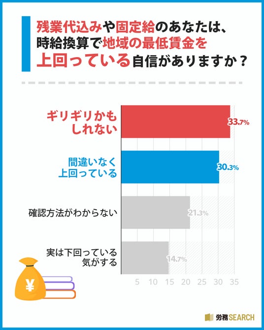 ・最低賃金を確実に上回っていると自信を持つ人は3割程度