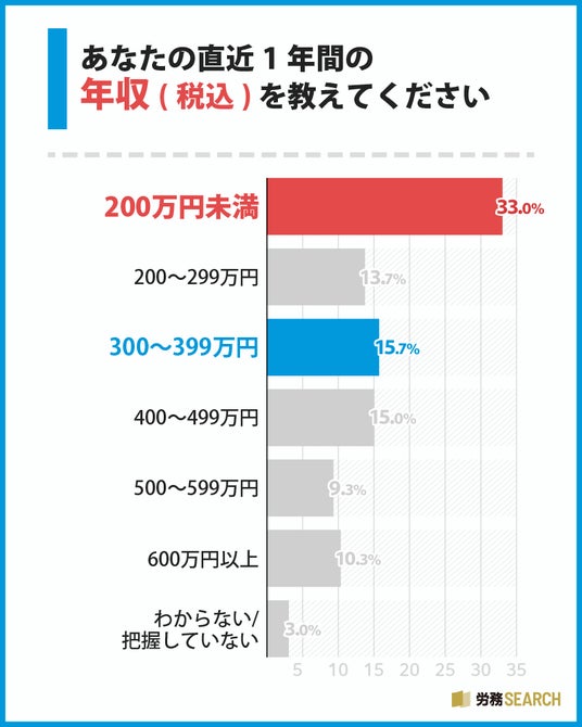 また、300~399万円、400~499万円といった層も一定数存在しており、年収は300~500万円未満に集中している傾向が見られます。