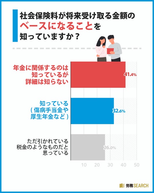 アンケートでは、社会保険料の役割を「詳しく理解している」と回答した人は約3割でした。「ただ引かれている税金のようなものだと思っている」という声もあり、負担感だけが先行している現状がうかがえます。社会保険料(健康保険、厚生年金保険など)は、傷病時の手当金や将来の老齢年金など、給付額の算出ベースになります。