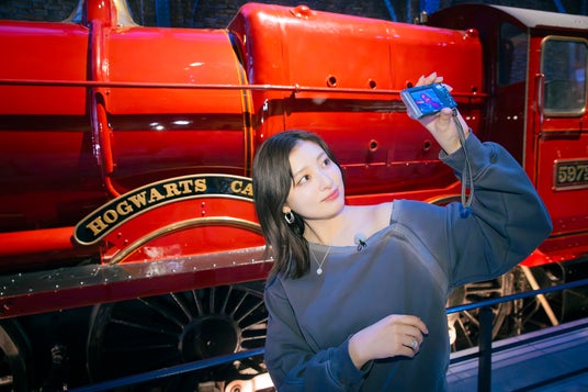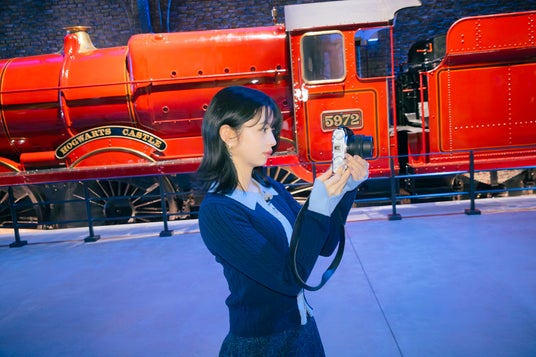 カメラ好きのふたりにとって、スタジオツアー東京は思わず撮影したくなるスポットが数多くあるのも魅力。11歳の少年ハリーが初めて魔法の世界へと足を踏み入れたロンドン キングス・クロス駅の9と3/4番線のセットには、ホグワーツ特急や、壁を通り抜ける手荷物カートなど、思わずシャッターを切りたくなるフォトスポットが並び、レンズを覗くふたりの表情も真剣そのもの。